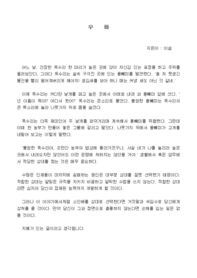 어느 날, 건장한 독수리 한 마리가 높은 곳에 앉아 자신감 있는 표정을 하고 주위를 둘러보았다, 그러다 독수리는 숲속 구석진 곳에 있는 올빼미를 발견했다. ´흥 저 못생긴 물건을 빨리 떨어져버리게 해야지! 생김새를 보아 하니 매는 커녕 새도 아닌 것 같네.´