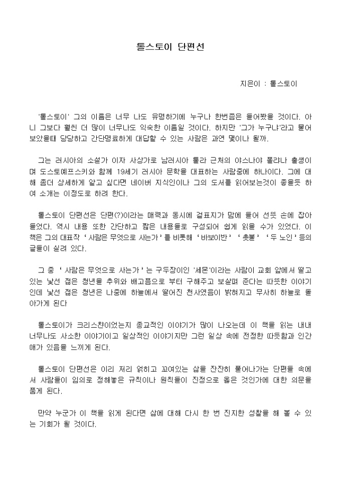 ´톨스토이´ 그의 이름은 너무 나도 유명하기에 누구나 한번쯤은 들어봤을 것이다. 아니 그보다 훨씬 더 많이 너무나도 익숙한 이름일 것이다. 하지만 ´그가 누구냐´라고 물어보았을때 당당하고 간단명료하게 대답할 수 있는 사람은 과연 몇이나 될까.