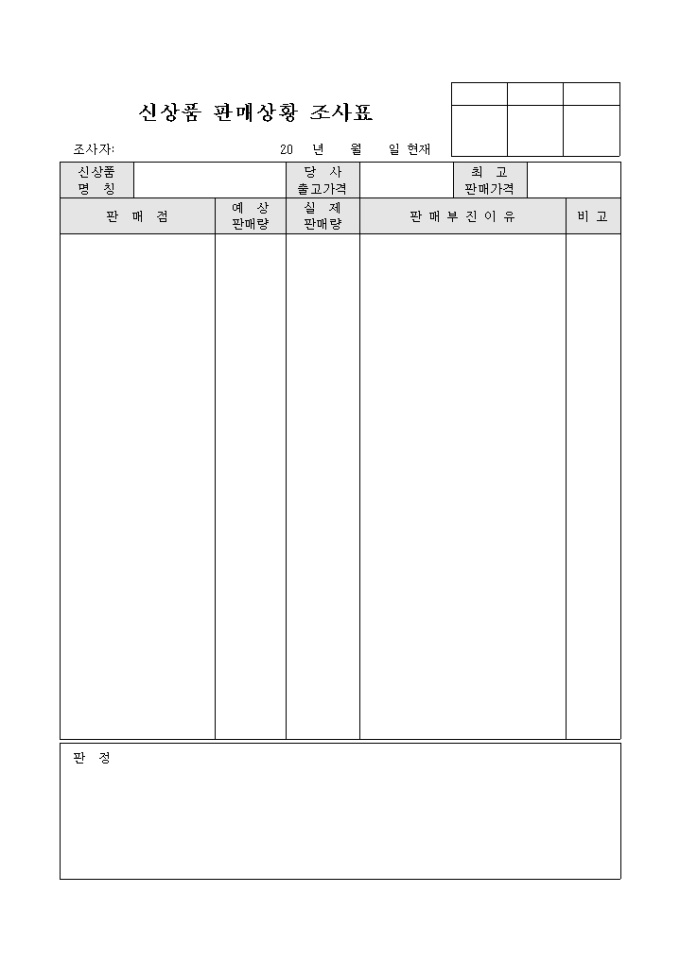 9,000원/월신상품에 대한 판매상황을 조사하고 기록할 수 있는 신상품 판매상황 조사표 양식입니다. 신상품명칭, 당사출고가격, 최고판매가격, 판매점, 예상판매량, 실제판매량, 판매부진이유, 비고의 항목으로 구성되어있습니다.