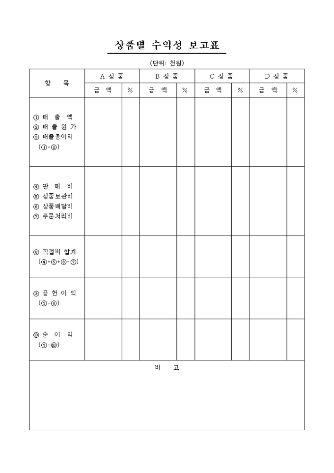 9,000원/월각 상품별로 수익성을 조사 보고할 수 있는 상품별 수익성 보고표 양식입니다. 각 항목에 대해서 제품별로 조사할 수 있습니다.