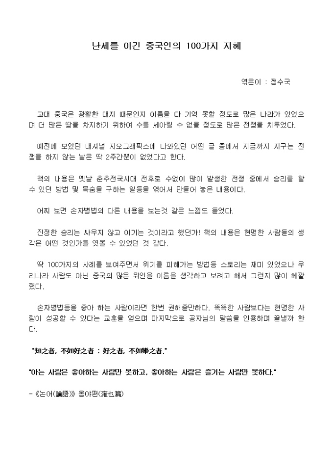 [독후감]난세를 이긴 중국인의 100가지 지혜_정수국 엮음