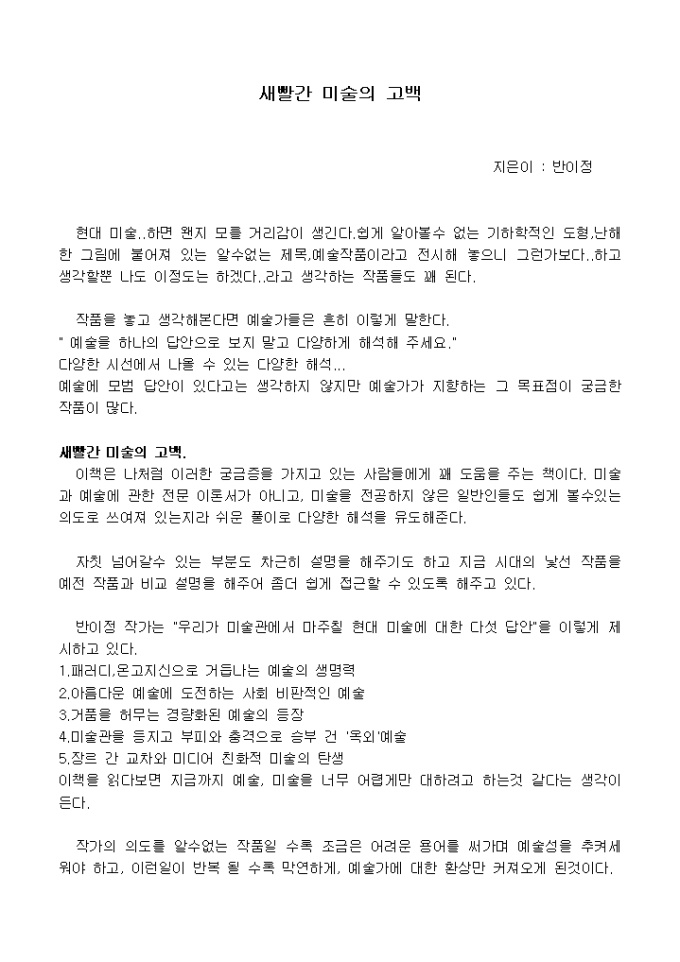 현대 미술..하면 왠지 모를 거리감이 생긴다.쉽게 알아볼수 없는 기하학적인 도형,난해한 그림에 붙어져 있는 알수없는 제목,예술작품이라고 전시해 놓으니 그런가보다..하고 생각할뿐 나도 이정도는 하겠다..라고 생각하는 작품들도 꽤 된다.