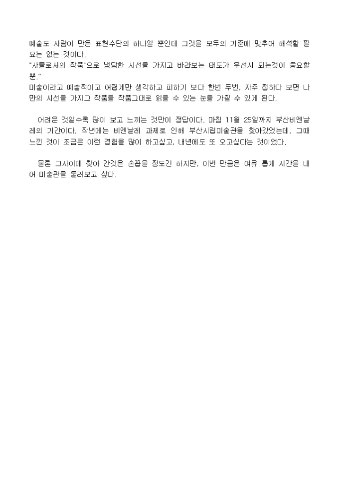 " 예술을 하나의 답안으로 보지 말고 다양하게 해석해 주세요."