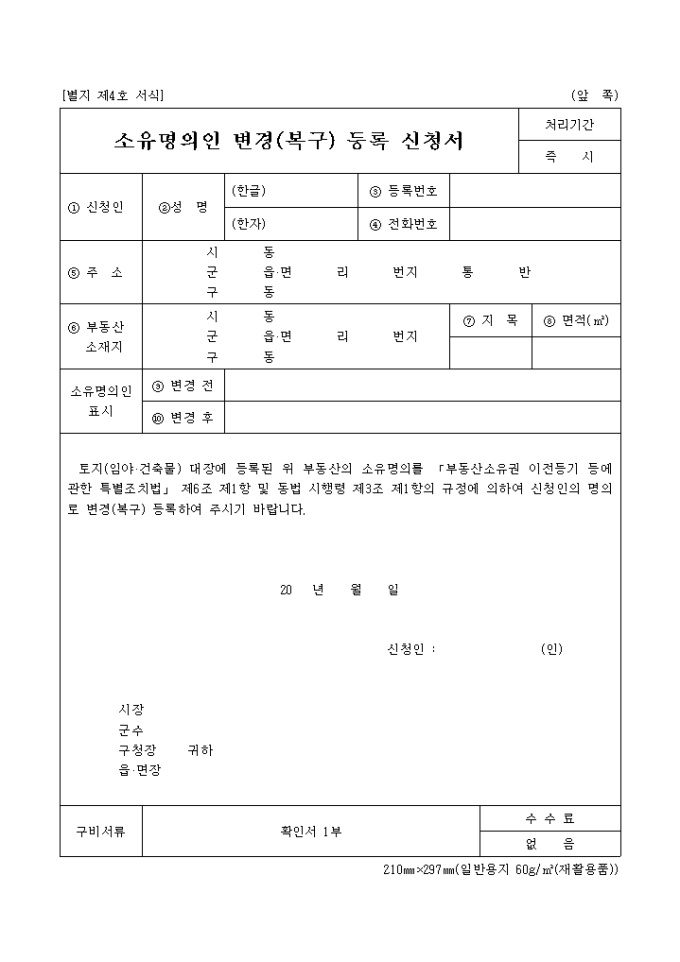 소유명의인 변경(복구)등록 신청서