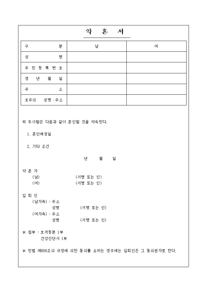 9,000원/월약혼을 문서화 해 놓은 서식입니다. ※ 민법 제808조의 규정에 의한 동의를 요하는 경우에는 입회인은 그 동의권자로 합니다.