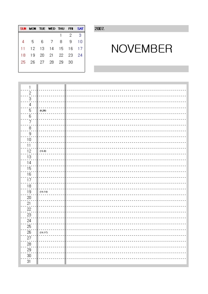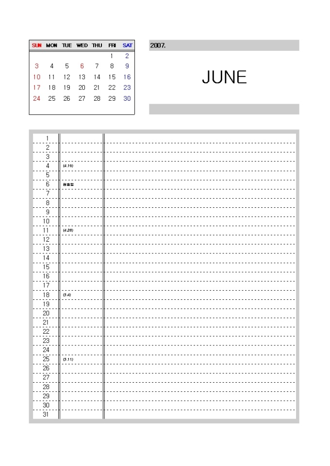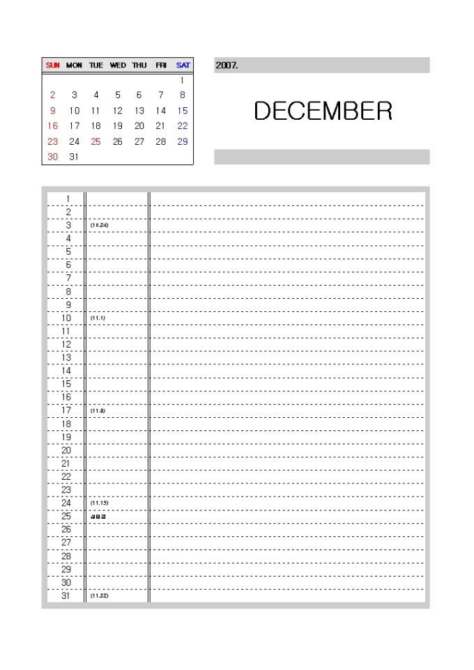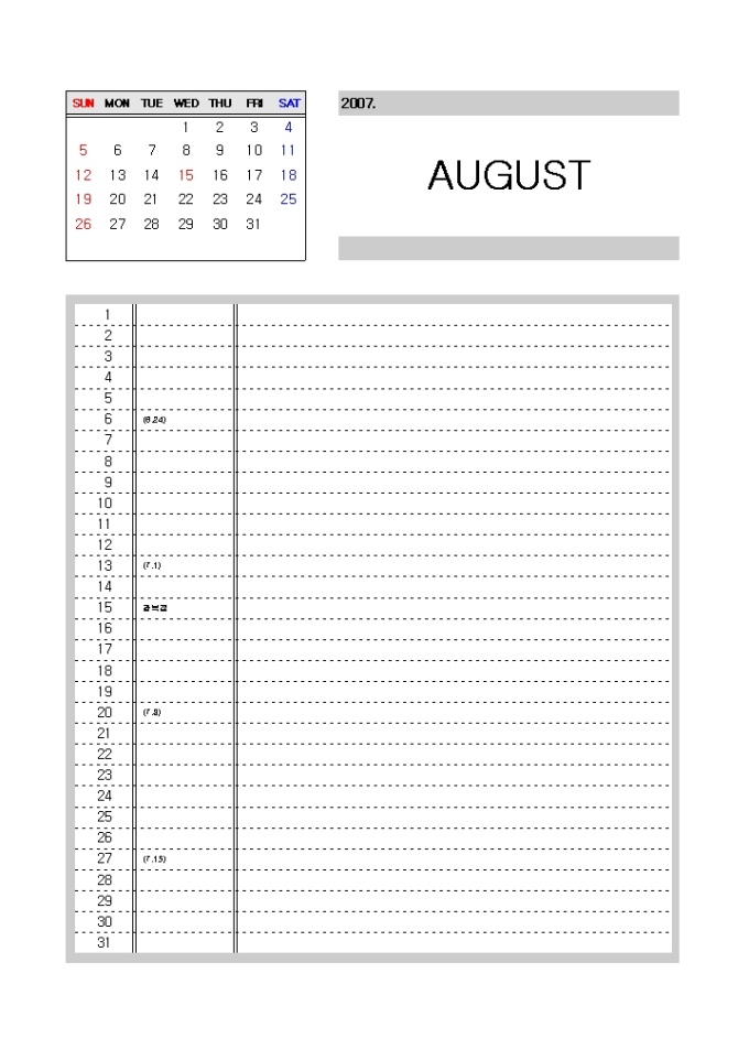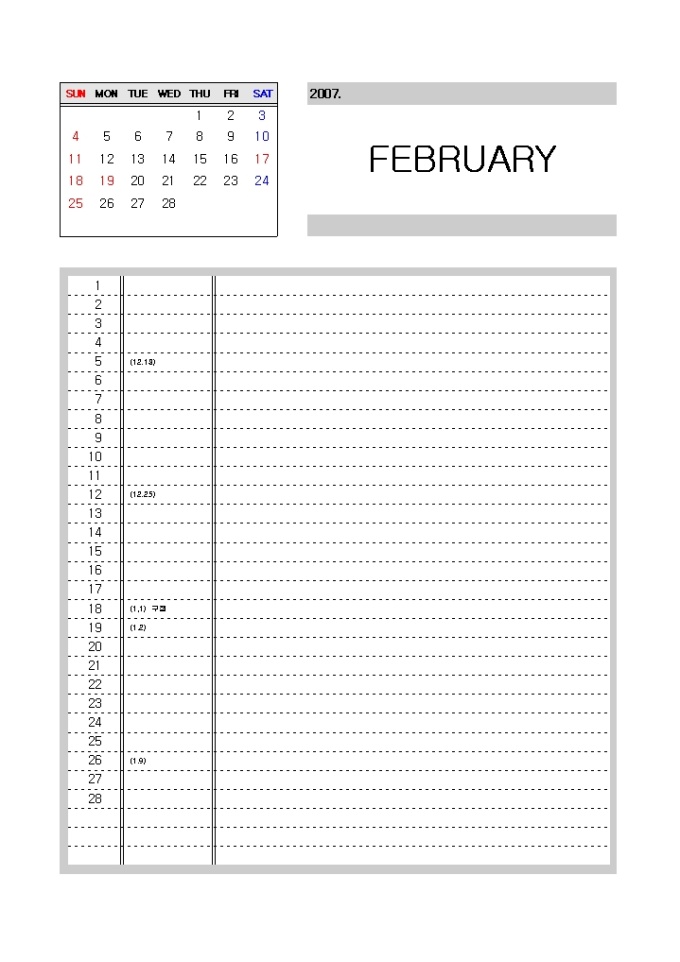 [2007년 달력]일별 메모하기 좋은 구성(리스트형식)