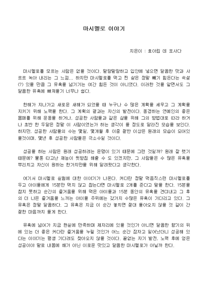 9,000원/월마시멜로를 모르는 사람은 없을 것이다. 말랑말랑하고 입안에 넣으면 달콤한 맛과 사르르 녹아 내리는 그 느낌... 하지만 마시멜로를 먹고 찐 살은 정말 빼기 힘든다는 속설(?) 있을 만큼 그 유혹을 넘기기는 여간 힘든 것이 아니였다. 이러한 것을 알면서도 그 달콤한 유혹에 빠져들기 너무나 쉽다.