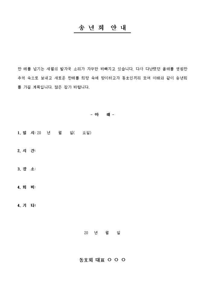 9,000원/월동호회 송년회 시 그 내용을 알릴 때 사용하는 송년회안내문 양식입니다.