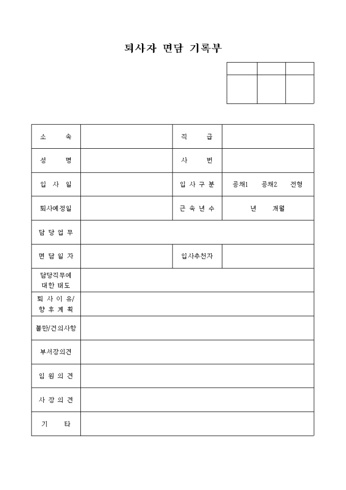 퇴사예정일, 담당직무에 대한 태도, 퇴사이유, 향후계획, 불만, 건의사항 등 퇴사자와 면담이 끝난 후 사용할 수 있는 양식입니다.