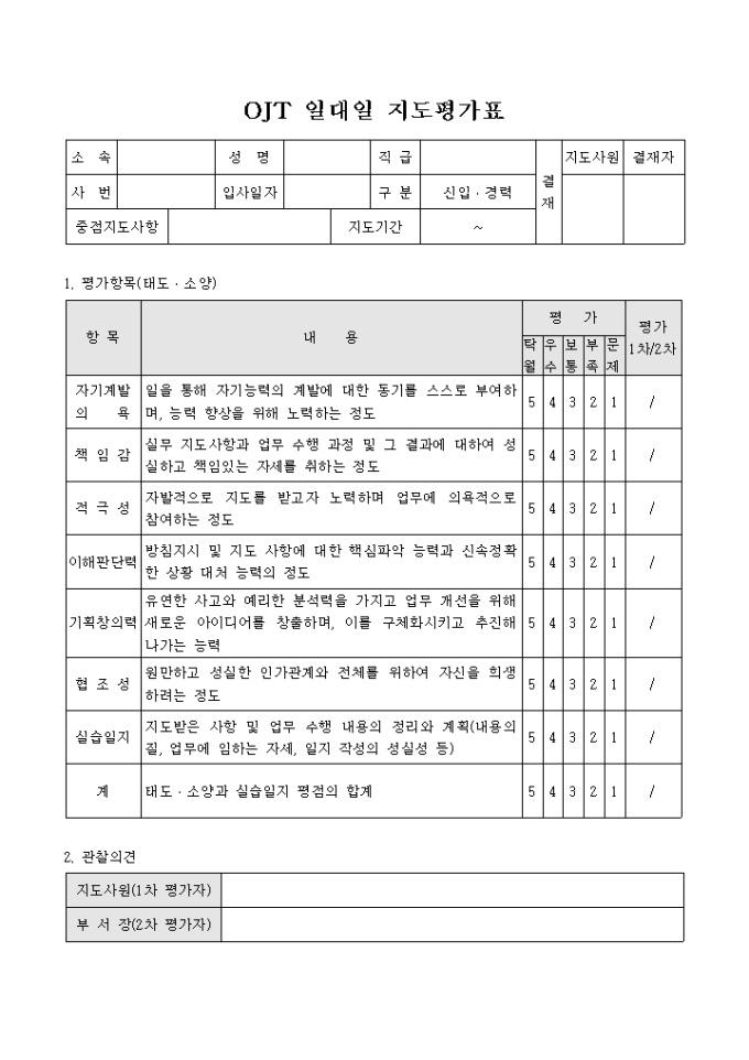 9,000원/월OJT실시 후 평가할 수 있는 평가표 양식으로, 자기계발의욕, 책임감, 저극성, 이해판단력, 기획창의력, 협조성등의 평가항목으로 구성되어 있습니다.
