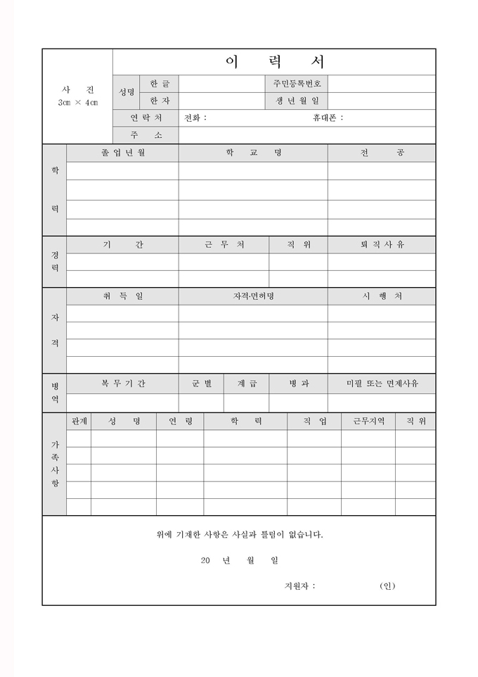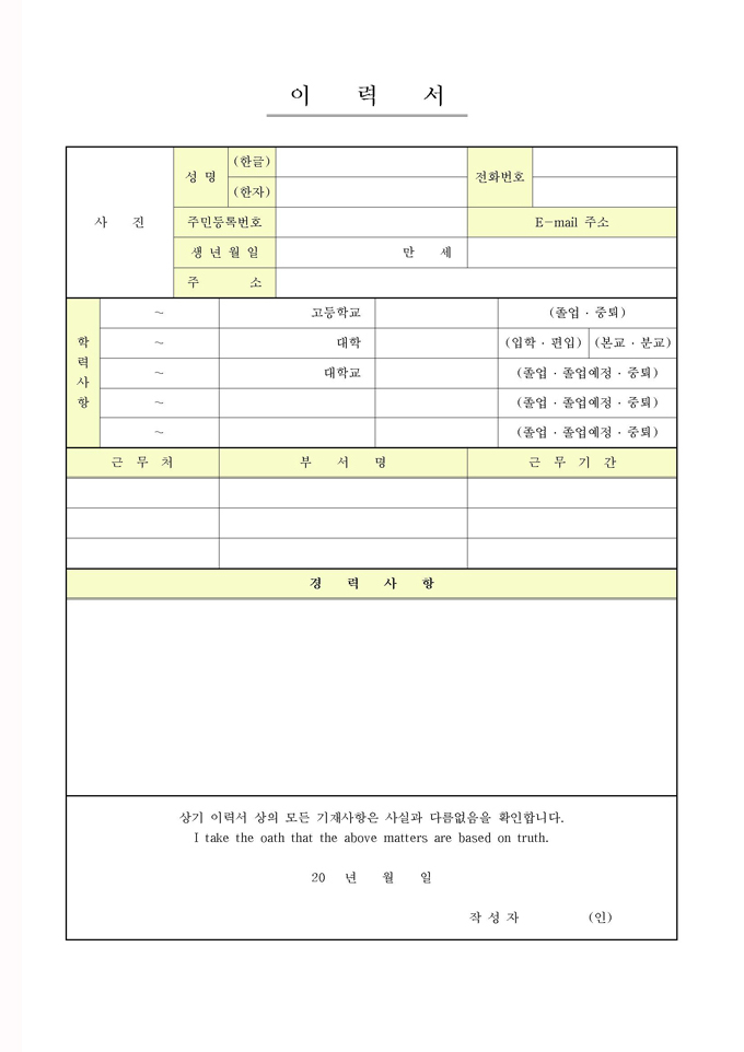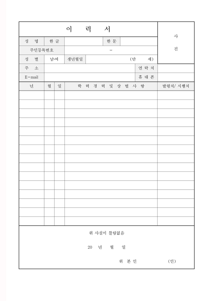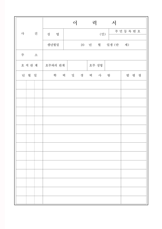 9,000원/월기본 이력서 양식 5건을 모은 압축파일입니다. * 파일형태: 한글. 워드 * 파일리스트 [이력서]문방구용이력서(칼라) [이력서]기본구성(경력위주구성_칼라) [이력서]기본사항에 충실한 구성(3단표구성) [이력서]기본사항에 충실한 구성(심플한표형태) [이력서]기본적인 이력서 양식(기본)