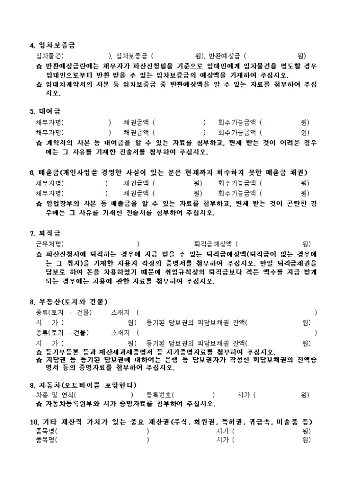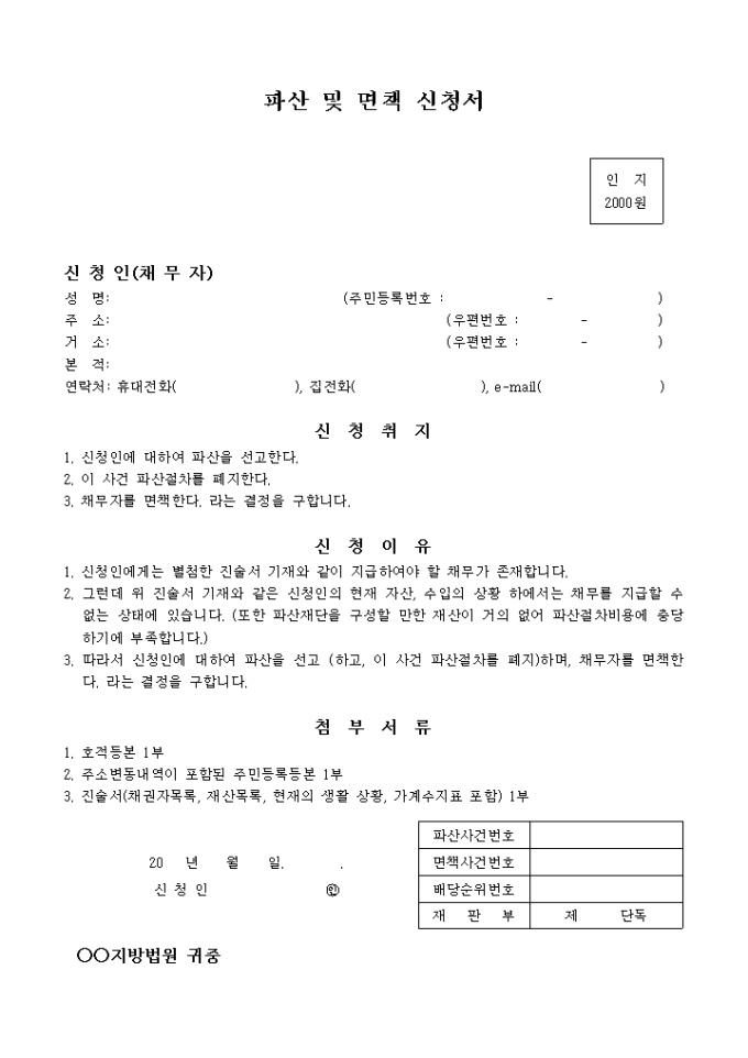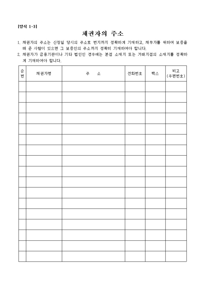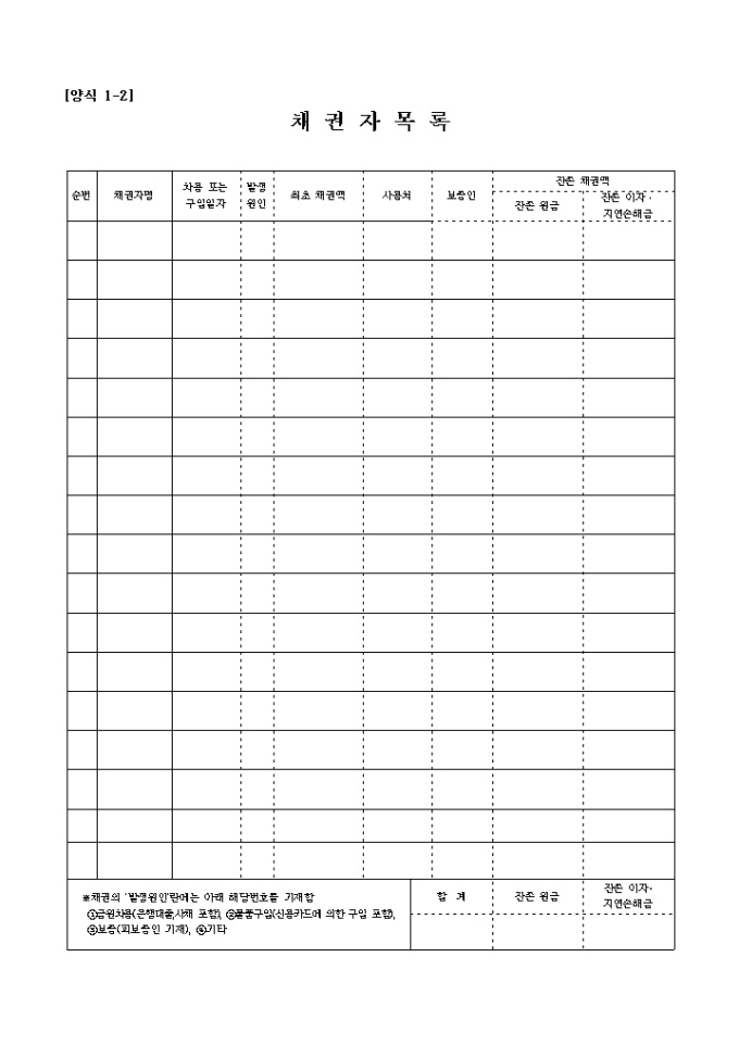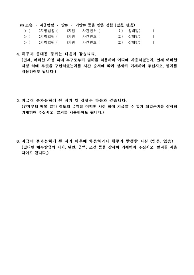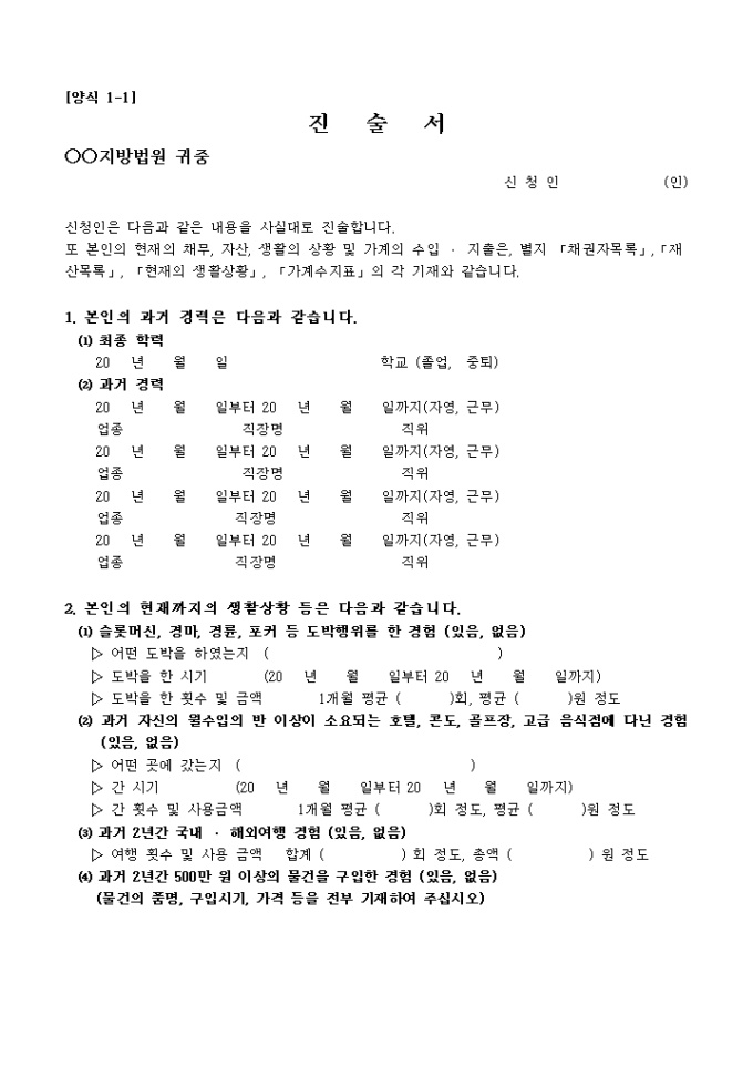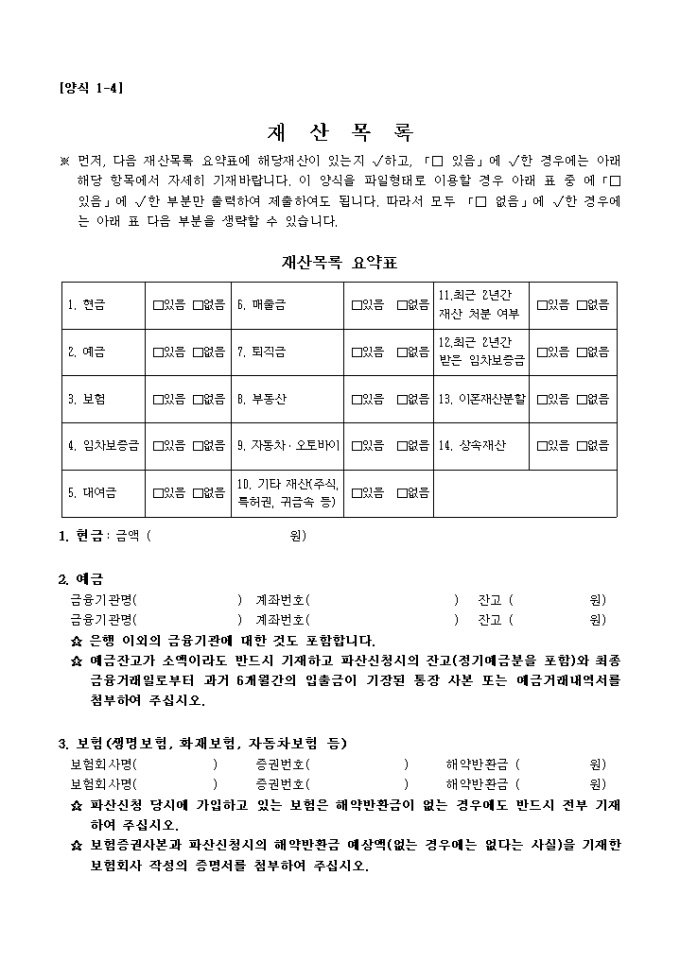 9,000원/월채무자가 파산을 신청하고 면책을 구하고자 할 때 사용하는 파산 및 면책 신청서입니다. 진술서, 채권자목록, 채권자목록기재요령, 채권자의 주소, 재산목록, 현재의 생활상황 등의 항목으로 구성되어있습니다.