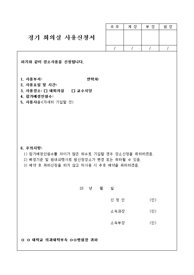 9,000원/월정기 회의실 사용을 신청할 때 사용하는 정기회의실사용신청서 양식입니다. 사용부서, 연락처, 사용요일, 시간, 사용장소, 참가예정인원수, 사용사유, 주의사항 등의 항목으로 구성되어있습니다.