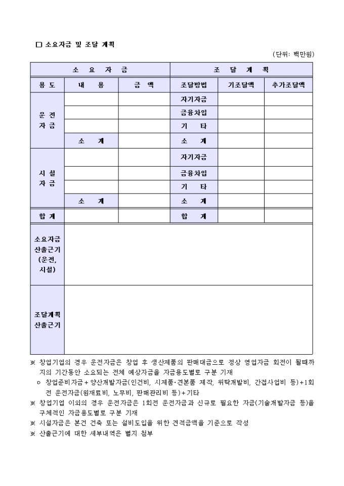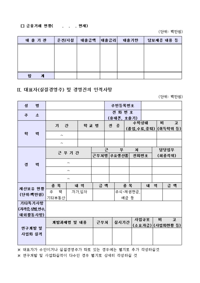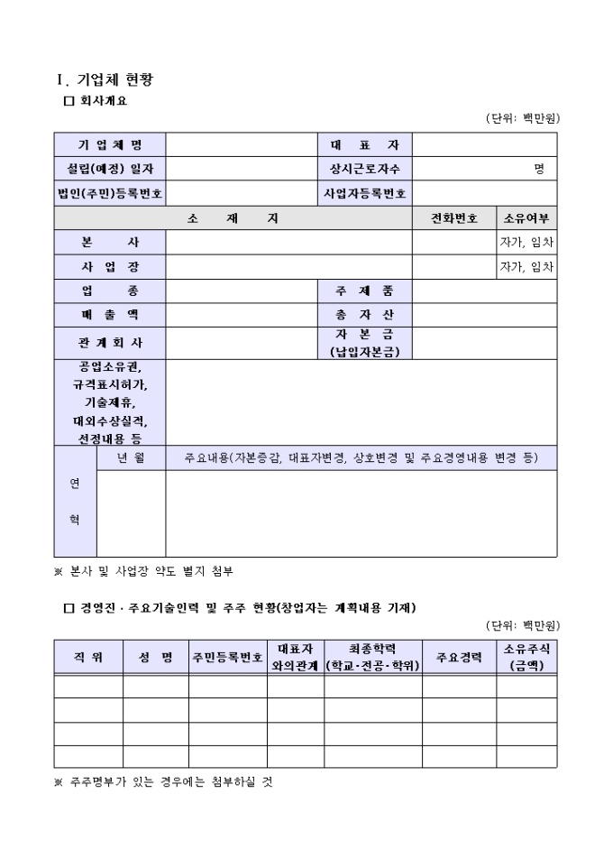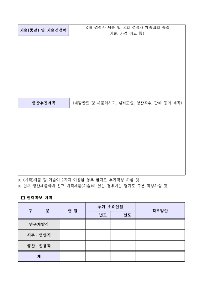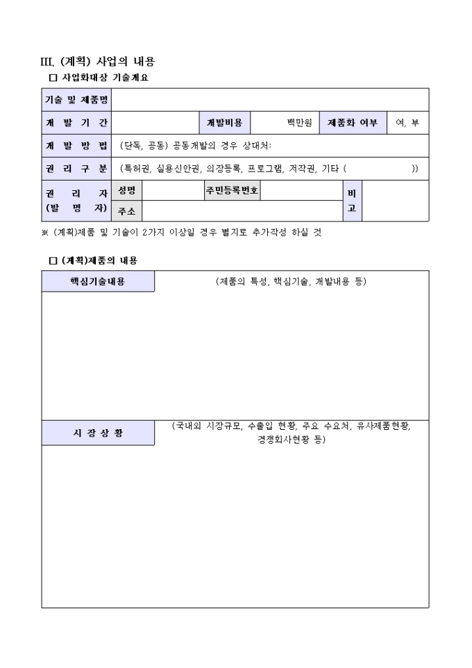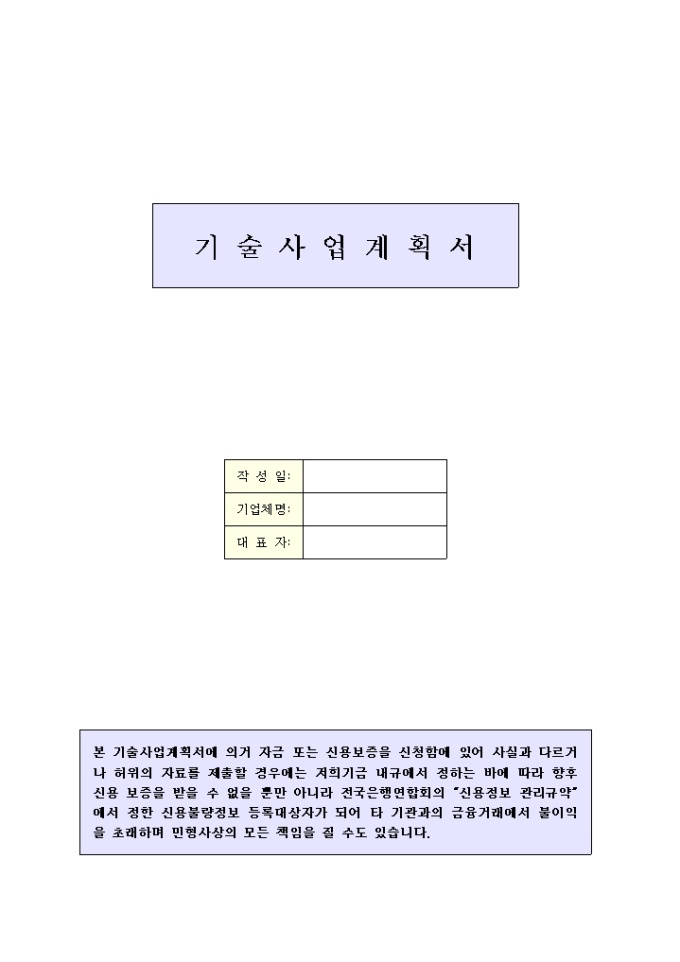 9,000원/월기업체현황, 대표자 및 경영진의 인적사항, 계획사업의 내용 등의 항목으로 구성된 기술사업계획서 양식입니다.