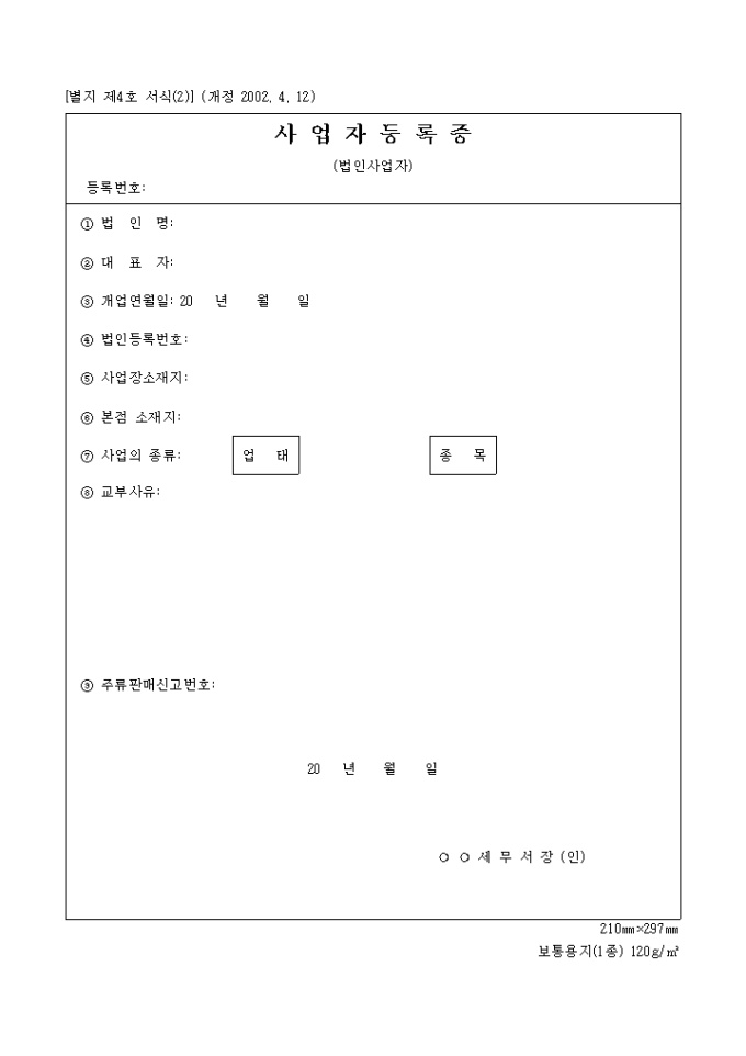 9,000원/월2002년 4월 12일 개정된 사업자등록증 양식입니다.
