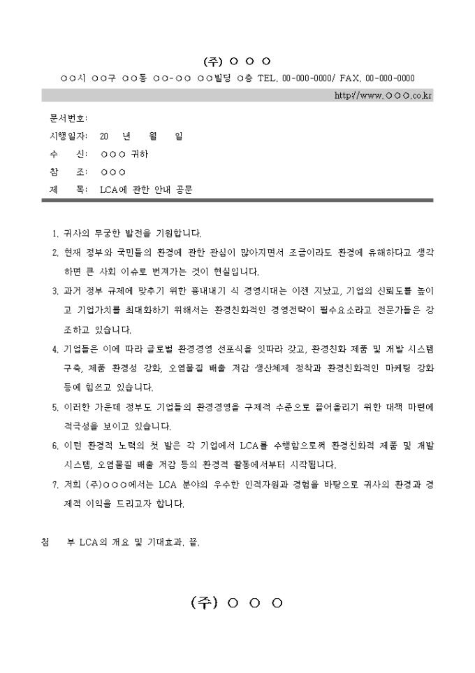 9,000원/월회사 LCA 안내에 관한 공문 예제입니다.