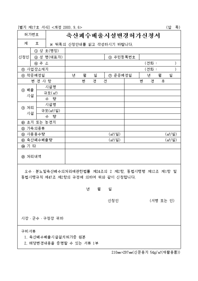 축산폐수배출시설변경허가신청서(개정 2003.9.6)