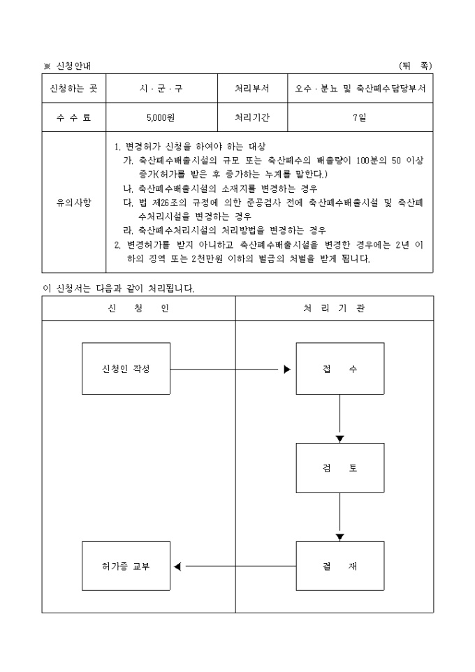 오수·분뇨및축산폐수의처리에관한법률 제24조의 2 제2항, 동법시행령 제12조 제1항 및 동법시행규칙 제47조 제2항의 규정에 의하여 위와 같이 신청할 때 사용하는 축산폐수배출시설변경허가신청서 양식입니다.