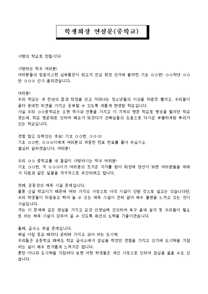 9,000원/월중학교 학생회장 연설문 내용이 담겨져 있는 학생회장 연설문입니다.
