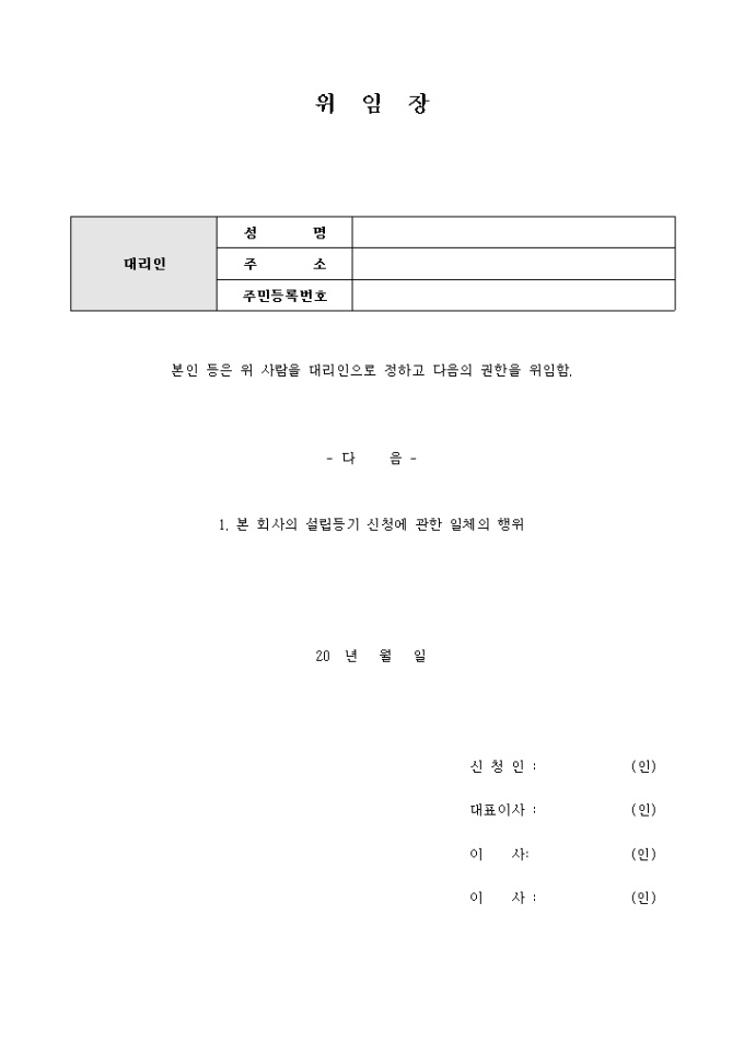 9,000원/월회사설립 등기 신청 위임장으로 회사의 설립등기 신청에 관한 일체의 내용을 위임한다는 내용과 대리인 및 신청인의 인적사랑 기재란으로 구성되어 있습니다.