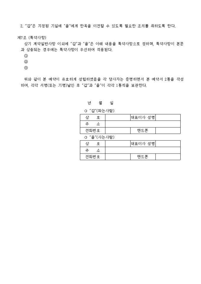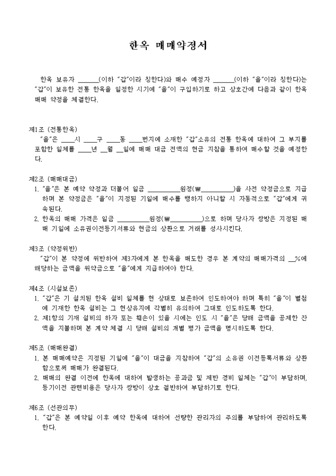9,000원/월한옥 매매약정서 양식입니다. 제1조 (전통한옥), 제2조 (매매대금), 제3조 (약정위반) 등 총 7조항의 계약조항으로 구성되어 있습니다.