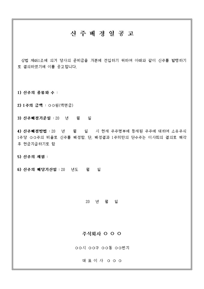 신주배정일 공고문 양식입니다. 신주의 종류와 수, 1주의 금액, 신주배정기준일, 신주배정방법 등의 항목으로 구성되어있습니다.