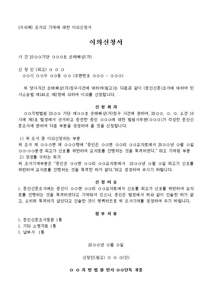 증인신문 조서기재에 대한 이의신청서 양식입니다. 목격자의 증언 수정을 신청하는 내용입니다.
