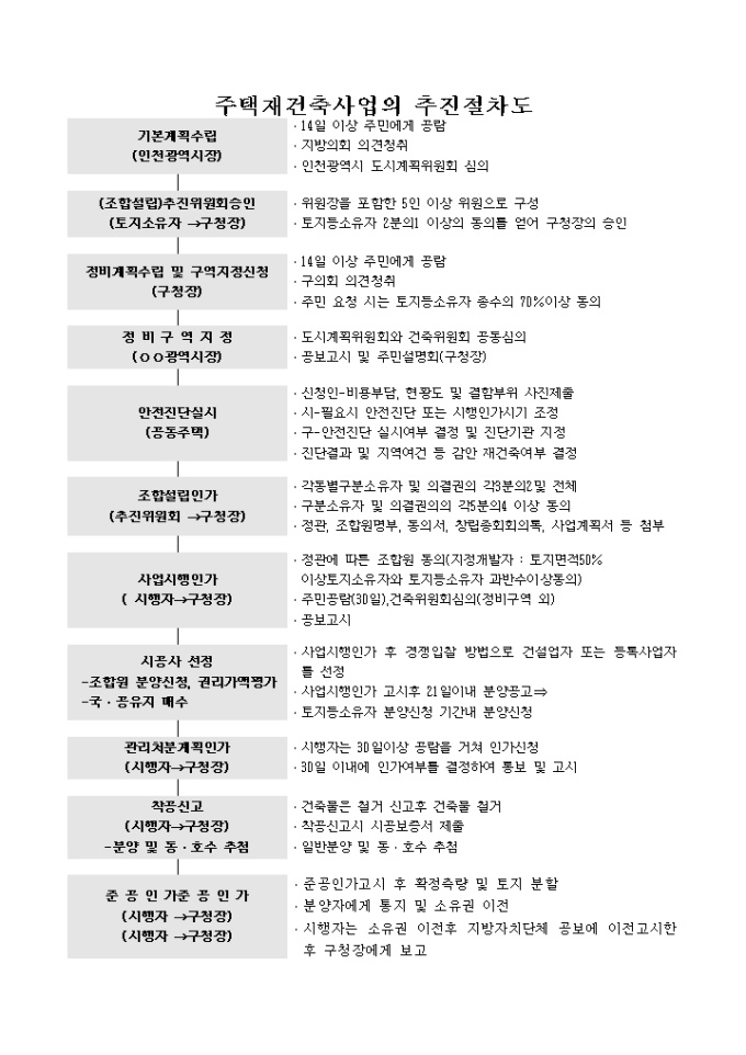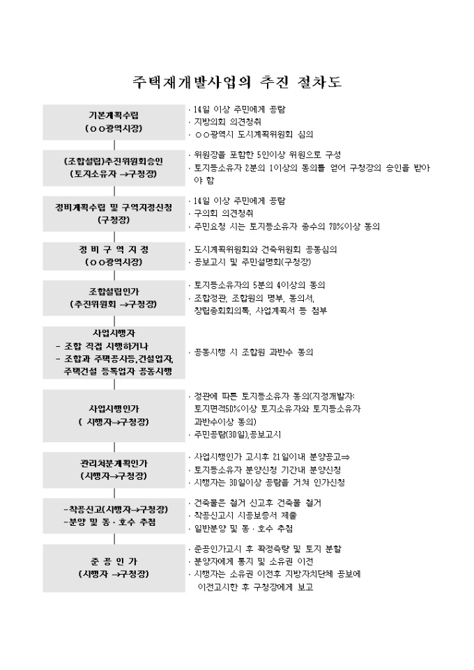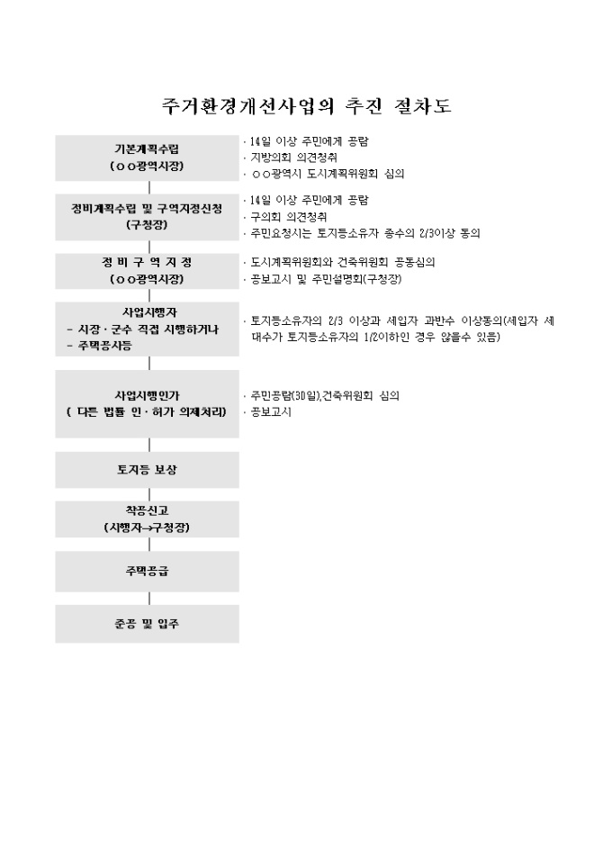 9,000원/월주택재건축,재개발 및 주거환경개선사업의 추진절차도 양식입니다. 각 사업의 절차가 순서도 형식으로 구성되어 있습니다.