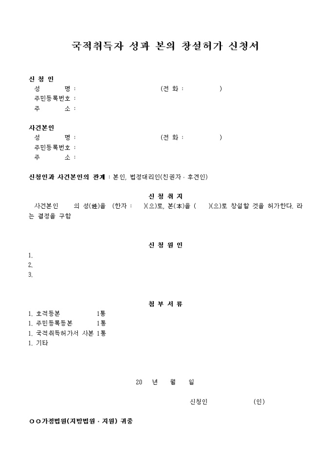 9,000원/월국적취득자가 성과 본의 창설허가를 신청하고자 할 때 사용하는 국적취득자 성과 본의 창설허가 신청서입니다. 신청인, 사건본인, 신청인과 사건본인의 관계 등의 항목으로 구성되어있습니다.