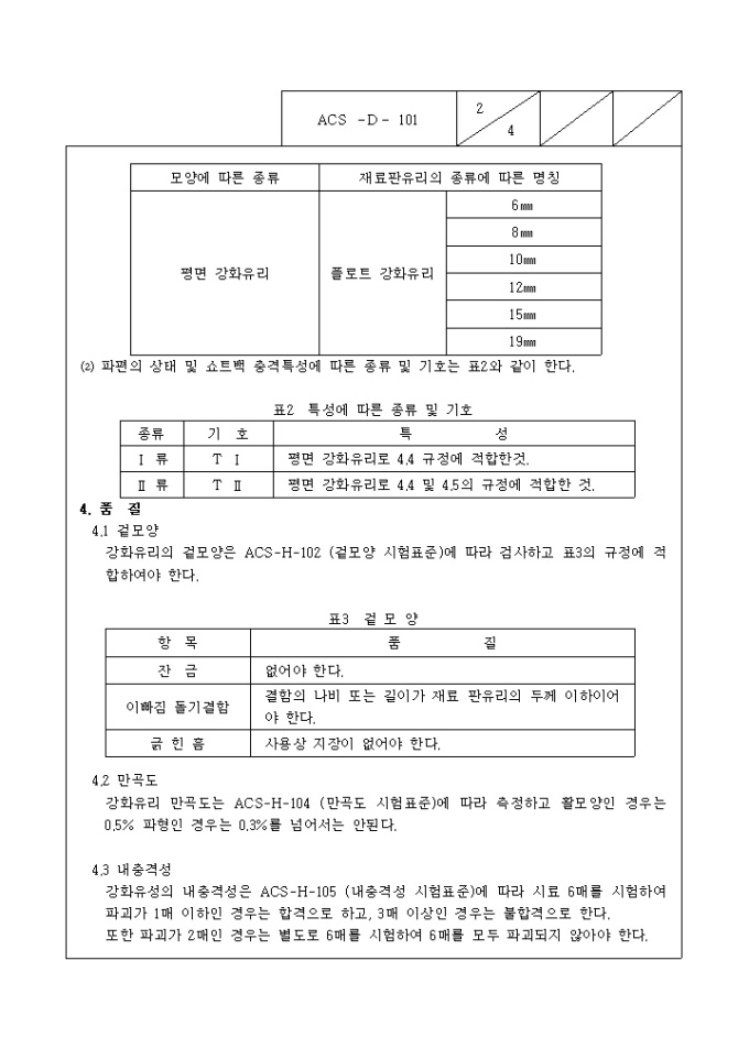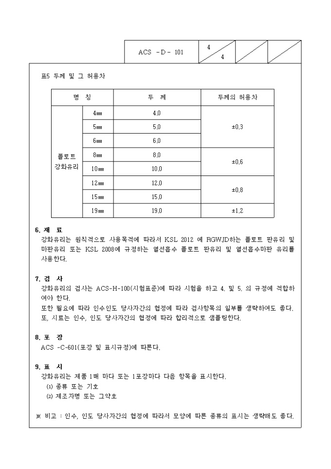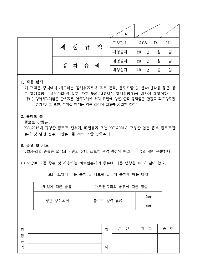 9,000원/월적용 범위, 용어의 뜻, 종류 및 기호, 품질, 모양, 치수 및 허용차, 재료, 검사, 포장, 표시 등으로 구성된 강화유리에 대한 제품규격 양식입니다.