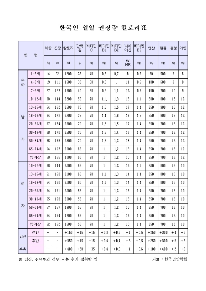 한국영양학회에서 발표한 한국인 일일 권장량 칼로리표입니다.