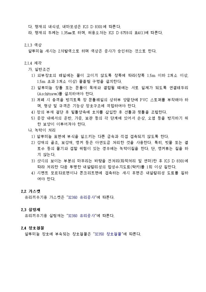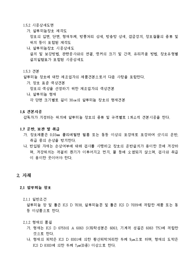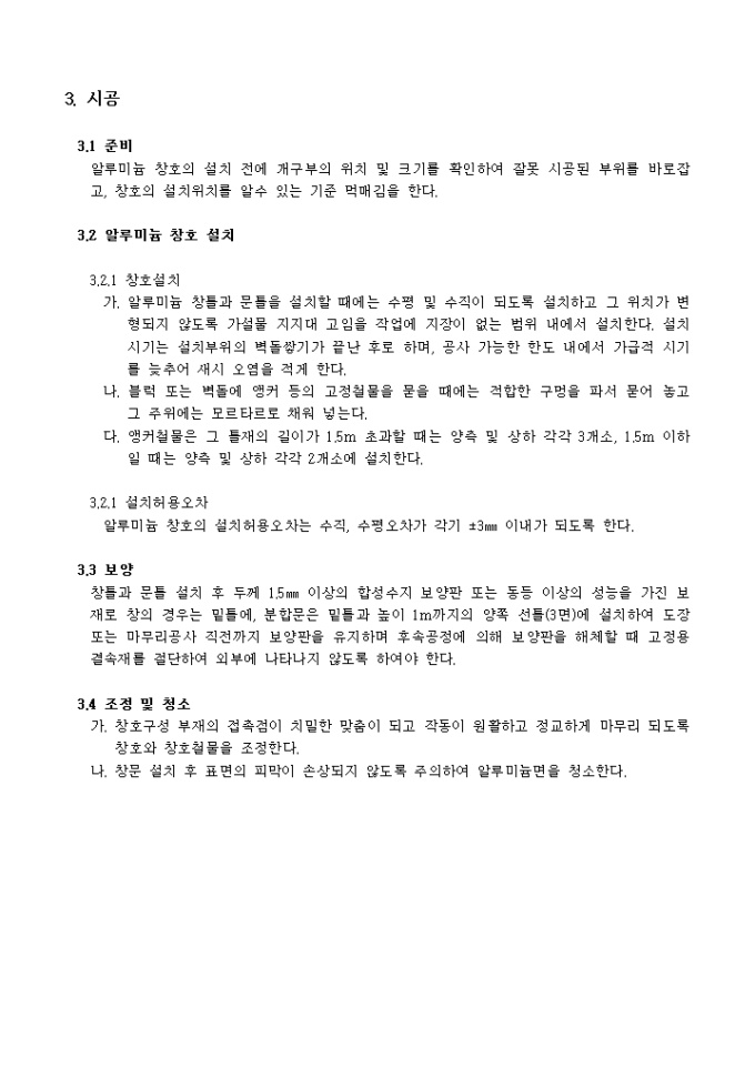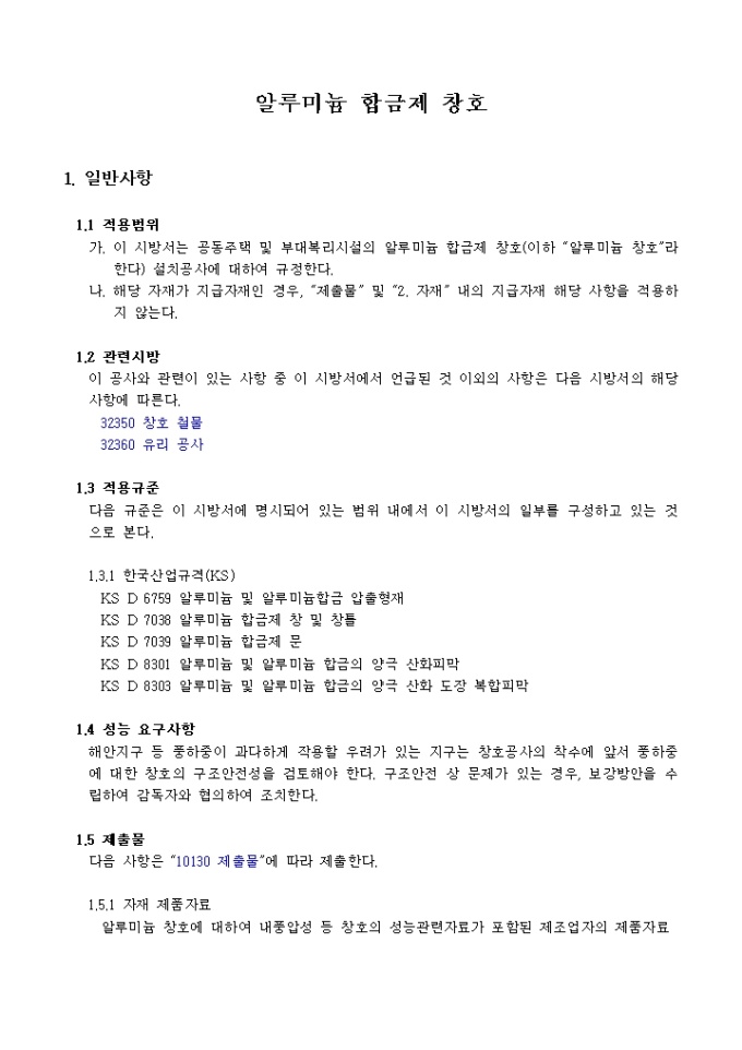 공동주택 및 부대복리시설의 알루미늄 합금제 창호 설치공사에 대하여 규정해 놓은 알루미늄 합금제 창호 시방서입니다.