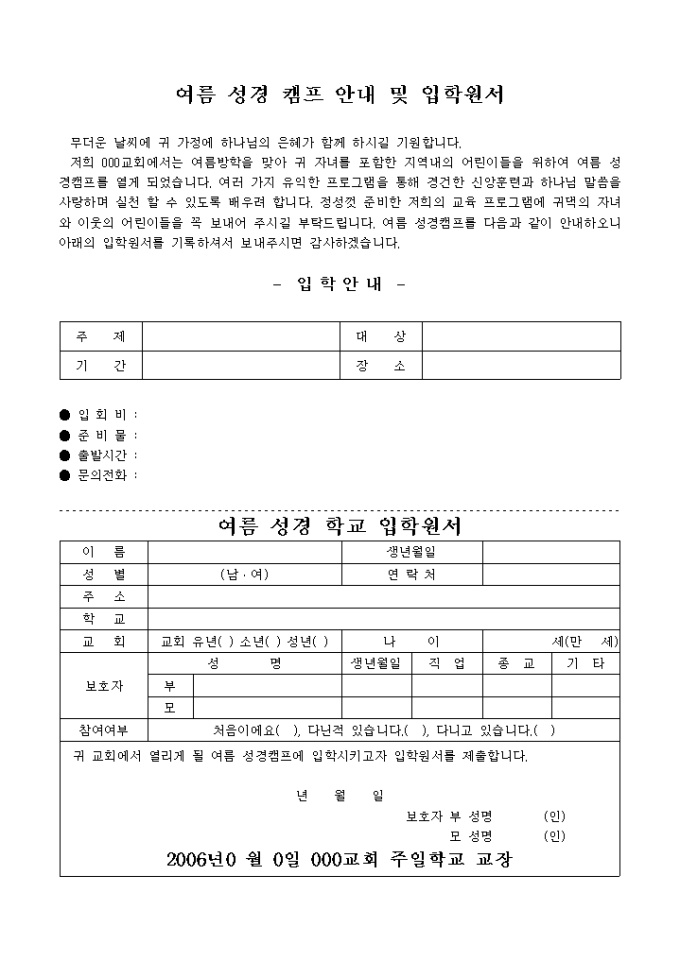 여름성경학교안내 및 입학원서