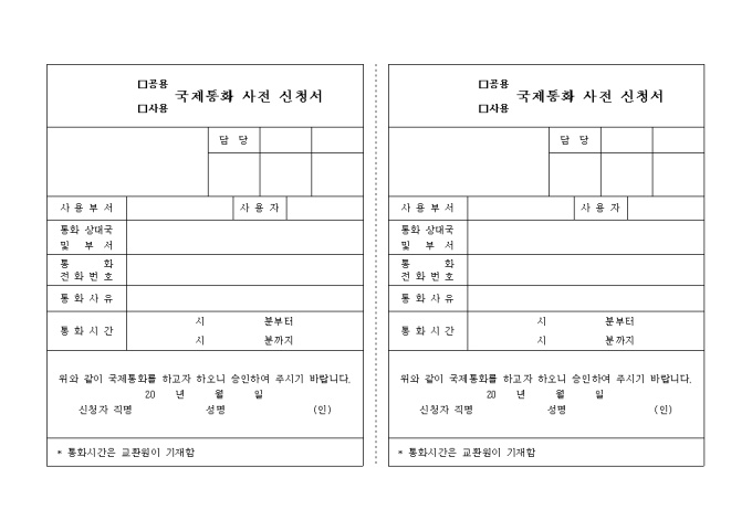 9,000원/월국제통화사전신청서 양식입니다. 위와 같이 국제통화를 하고자 하오니 승 인하여 주시기 바랍니다. 20 년 월 일 신청자 직명 성명 (인) ...