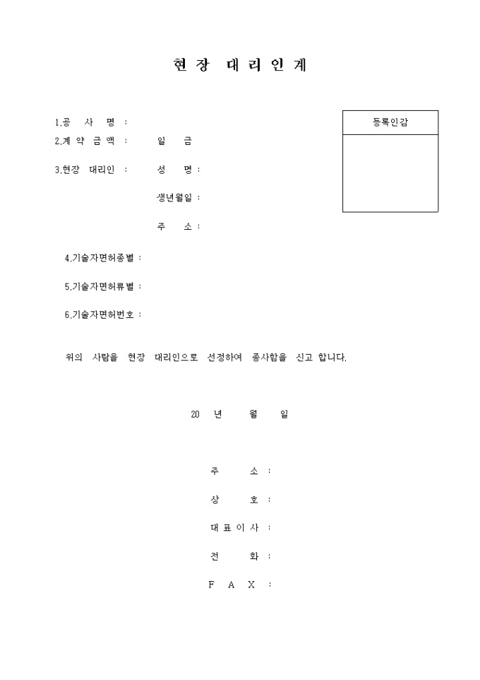 위의 사람을 현장 대리인으로 선정하여 종사함을 신고 합니다.