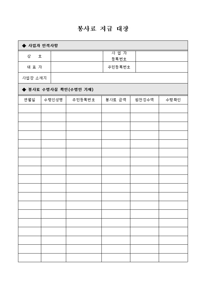 봉사료지급대장 양식으로, 사업자 인적사항, 봉사료 수령사실 확인 등의 항목으로 구성되어 있습니다.
