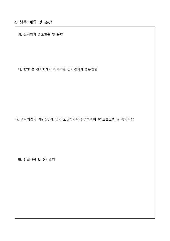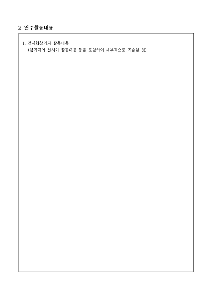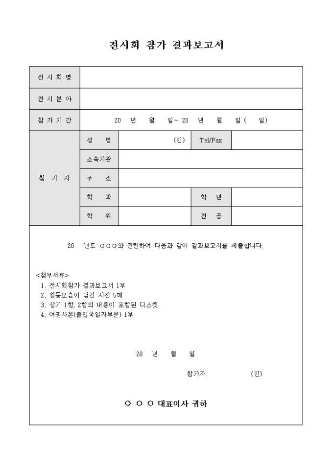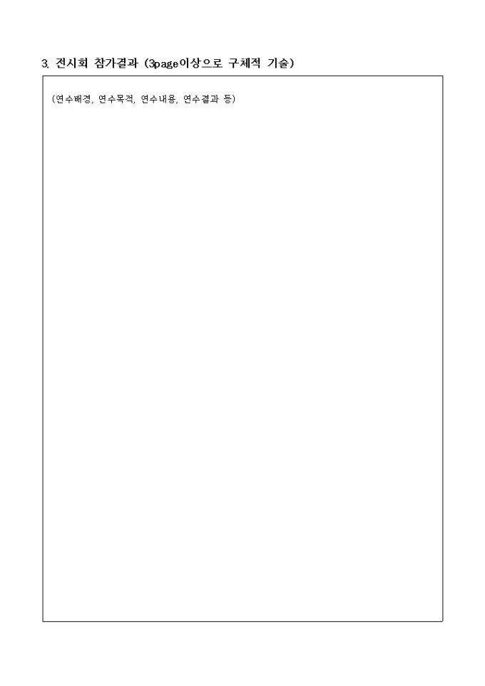 전시회명, 전시분야, 참가기간, 참가자, 참가일정 등의 항목으로 구성되어있는 전시회 참가 결과보고서입니다.