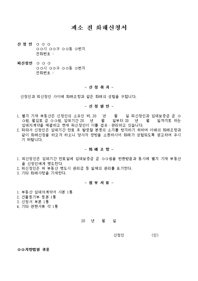 9,000원/월신청취지, 신청원인, 화해조항, 첨부서류 등의 내용이 작성되어있는 제소 전 화해신청서입니다.