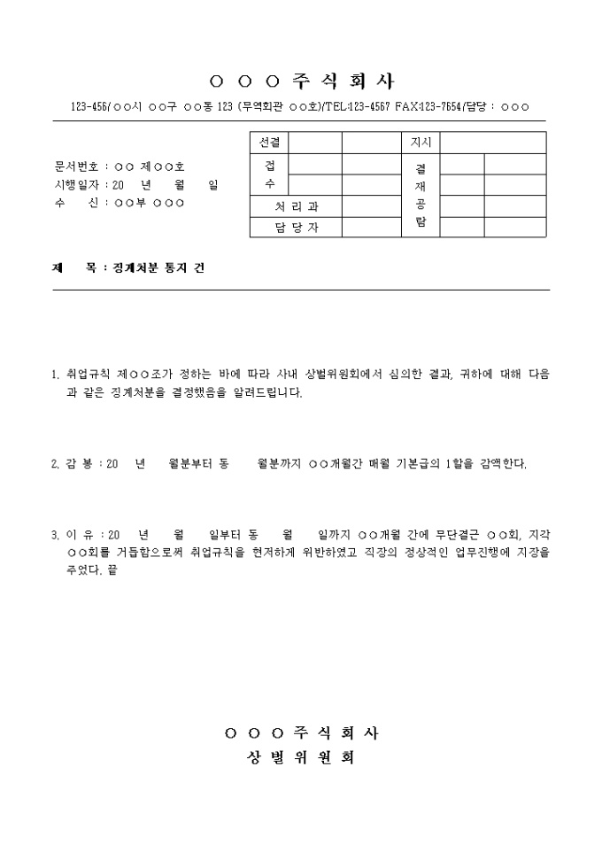9,000원/월사내 상벌위원회에서 심의한 결과로 감봉 처분한다는 내용의 통지문입니다.