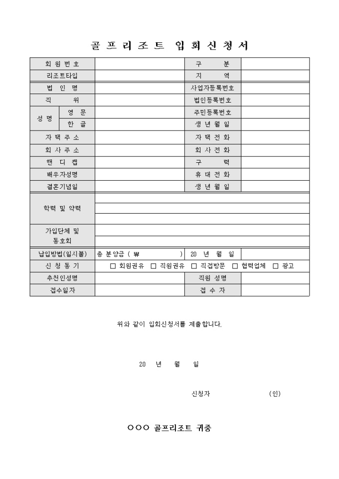 9,000원/월회원번호, 리조트타입, 법인명, 직위 등의 항목으로 구성되어있는 골프리조트 입회신청서입니다.