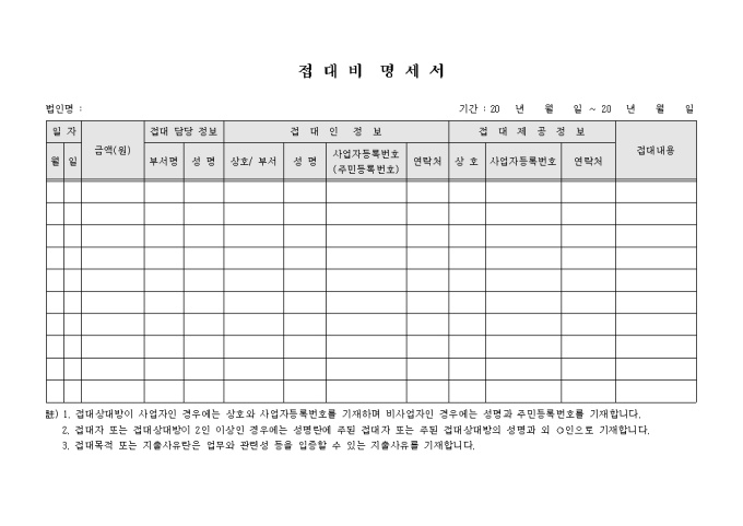 9,000원/월일자, 금액, 접대 담당 정보, 접대인정보 등의 항목으로 구성되어있는 접대비명세서입니다.