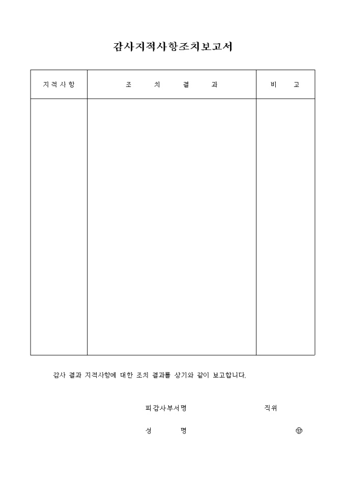 9,000원/월감사를 시행한 뒤 나타난 지적사항에 대해 적절한 조치를 하고 그 결과를 기입하는 양식입니다.