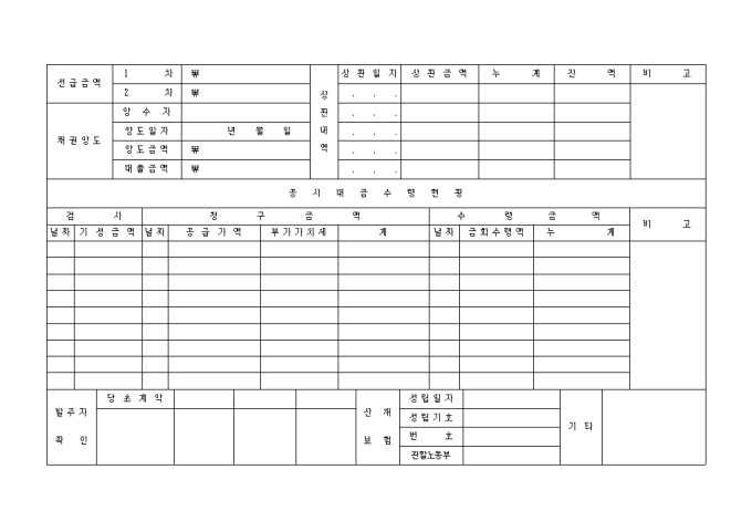 9,000원/월공사 계약금을 비롯해 공사기간, 하도급관련 내용, 공사대금 수령현황을 기재하는 양식입니다.