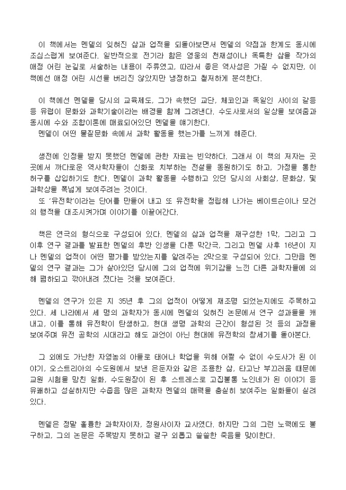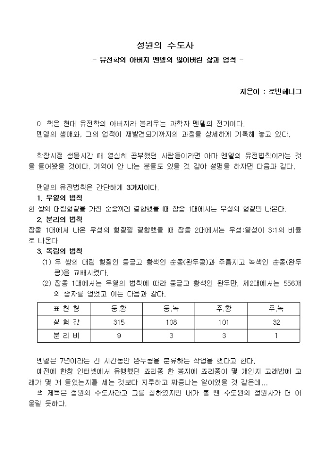 9,000원/월[본문 미리보기] 이 책은 현대 유전학의 아버지라 불리우는 과학자 멘델의 전기이다. 멘델의 생애와, 그의 업적이 재발견되기까지의 과정을 상세하게 기록해 놓고 있다. 학창시절 생물시간 때 열심히 공부했던 사람들이라면 아마 멘델의 유전법칙이라는 것을 들어봤을 것이다. 기억이 안 나는 분들도 있을 것 같아 설명을 하자면 다음과 같다.