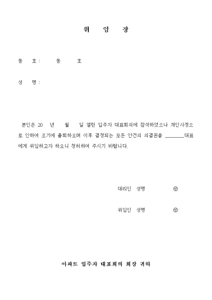 9,000원/월아파트 입주자 대표회의에 대한 의결권을 위임하는 내용의 위임장입니다.