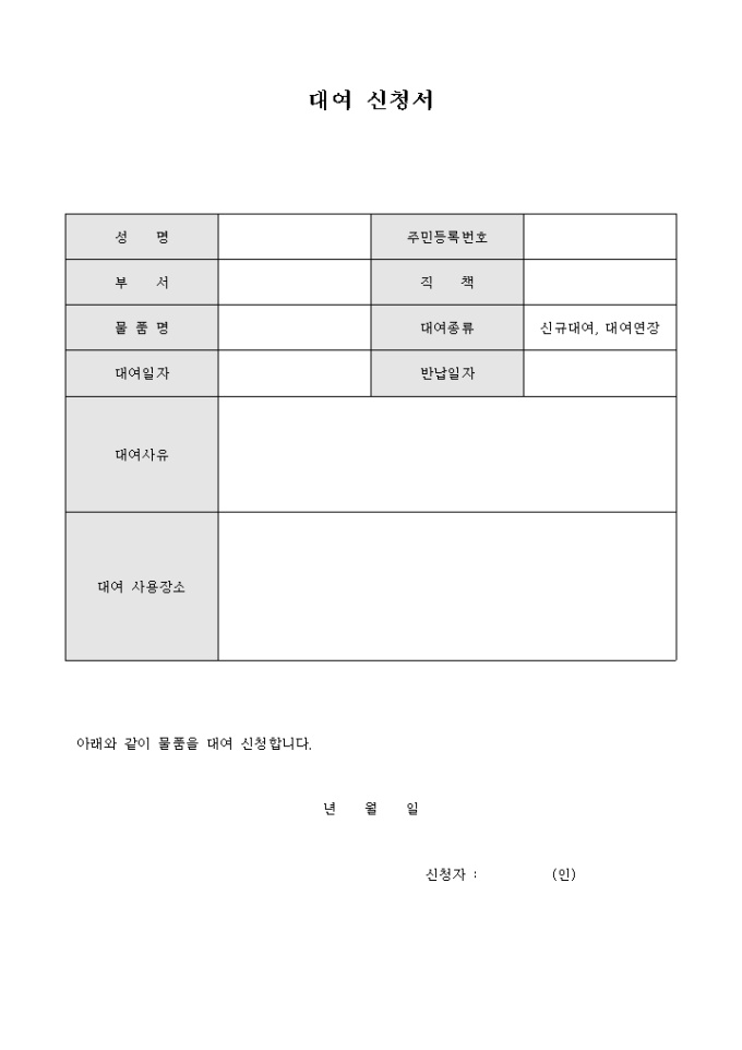 9,000원/월물품을 대여할때 신청하는 양식입니다.