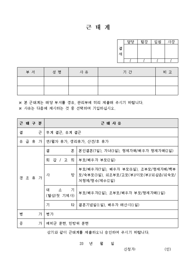 9,000원/월근태계 양식으로 근태를 종류별로 구분하여 사유를 상세히 기입할 수있도록 구성되어 있으며, 작성예도 함께 있습니다.