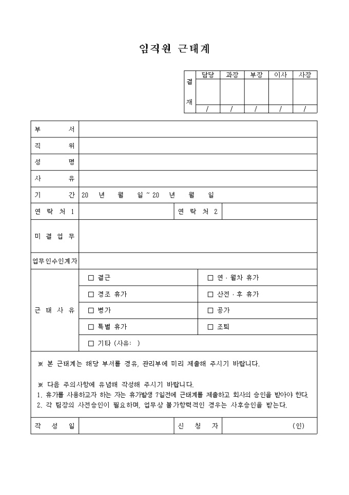 9,000원/월임직원 근태계 양식으로 부서, 직위, 성명, 사유, 기간, 연락처, 미결업무 등의 항목으로 구성되어 있습니다.