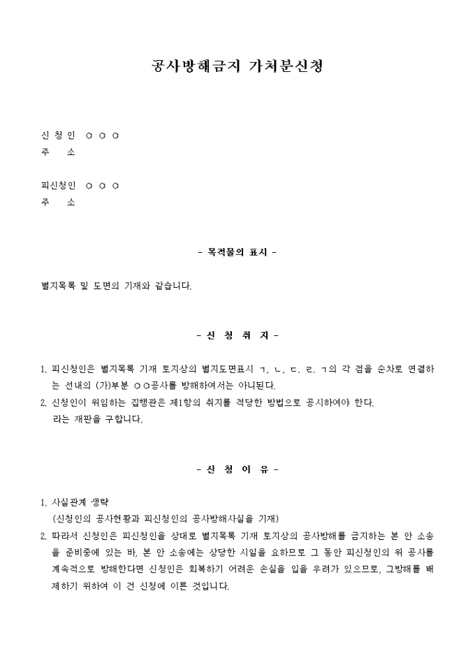 9,000원/월공사방해를 금지한다는 내용의 가처분신청서 샘플입니다.