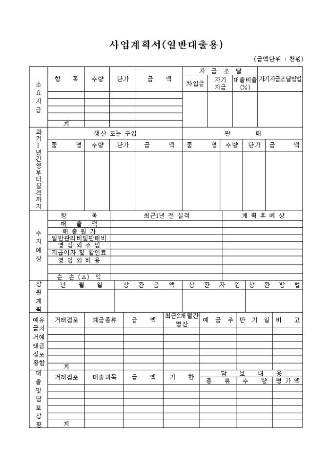 9,000원/월소요자금, 수지예상, 상환계획, 대출 및 담보상황 등의 항목으로 구성되어있는 사업계획서(일반대출용) 양식입니다.
